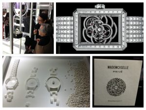 All’interno dello stand appositi pannelli (foto a lato) hanno ricreato i vari passaggi delle singole realizzazioni, dalla ceramica high-tech ai certosini quadranti con ricami e orli! I disegni da riprodurre, i rocchetti dei fili sottilissimi, le forbici o i colori degli smalti hanno stupito più di un visitatore. Il tutto supportato da un bellissimi video, adesso trasmesso anche in rete, capace di animare ogni differente capolavoro, mettendone in risalto le qualità d’alto artigianato nei dettagli che impreziosiscono le collezioni Madeoiselle Privée e dei Métiers d’Art, spesso ispirati alle opere giapponesi che impreziosivano la casa e lo studio di Mlle Coco.