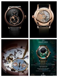 Jaquet Droz il Grande Seconde con la luna e il quadrante in smalto, e uno degli automi da polso che saranno esposti da Pisa Orologeria