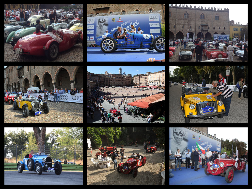 Nel collage delle foto che ricordano alcuni dei momenti del Gran Premio, oltre ai vincitori sull’Alfa Romeo n°46, l’auto n°21: Bugatti del 1929 degli svizzeri Koenig-Blandow, la n°44: ancora di un team elvetico, Suter-Volker, su Aston Martin Le Mans del 1934; la n°246 Fiat spyder 850 Siata del 1968 di Barali-Ferraresi; la n°56 Fiat 508 S coppa d’oro di Peli-Gasburri, la n°5 Bugatti 35 Grand Prix del 1925 team svizzero Meyer-Batouskova; la partenza da piazza Sordello a Mantova e un Palio davvero inedito in piazza del Campo a Siena.