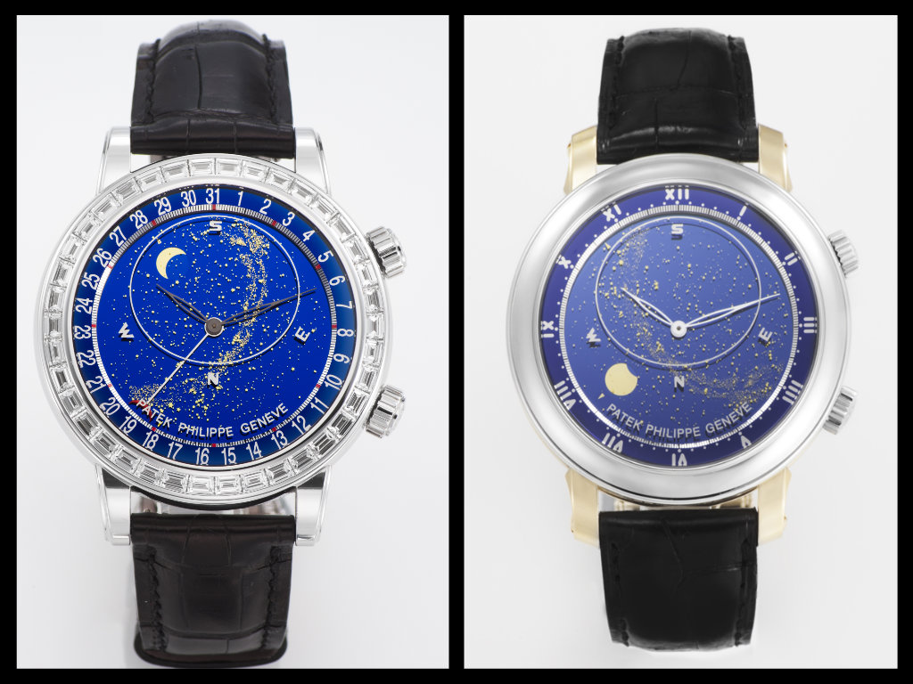 i due Celestial: a sinistra con la data, in oro bianco e diamanti, a destra cassa in platino e oro rosa