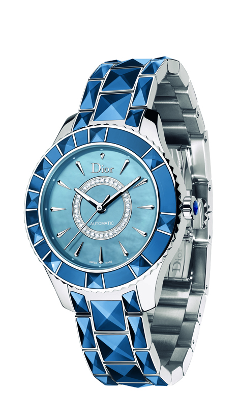 Il bracciale incastona nell’acciaio inserti piramidali in cristallo di zaffiro blu che rendono molto elegante questo segnatempo. Altrettanto intrigante la lunetta mentre al centro del quadrante brilla un cerchio in diamanti, ma quello che più conquista gli appassionati dell’orologeria meccanica è il movimento a carica automatica, visibile dal fondello e che presenta il rotore laccato di blu.