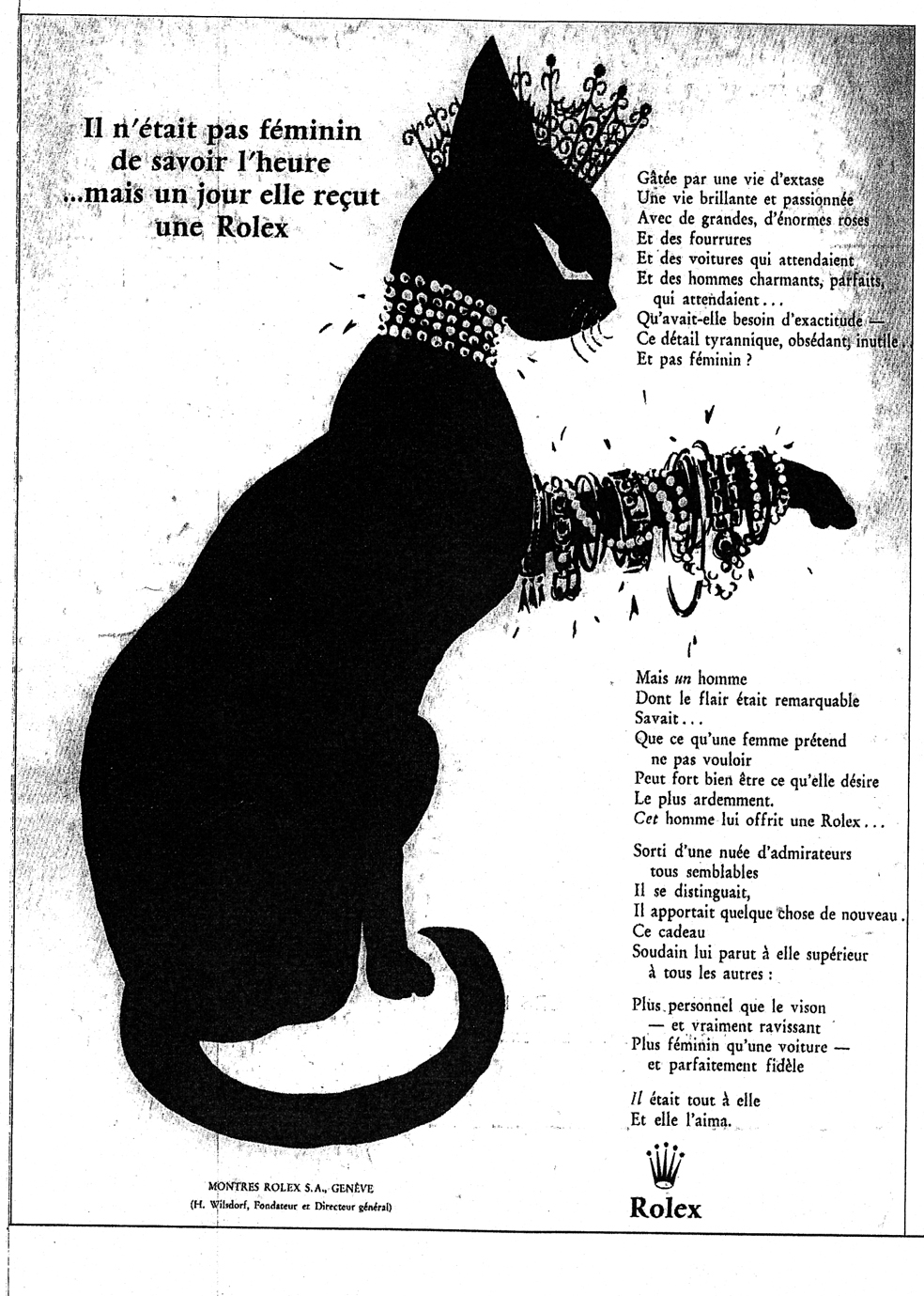 … testo in francese (qui in italiano), una gattina nera ingioiellata, la coroncina Rolex in un’interpretazione molto personale: “non è femminile conoscere l’ora…ma un giorno ella ricevette un Rolex”…