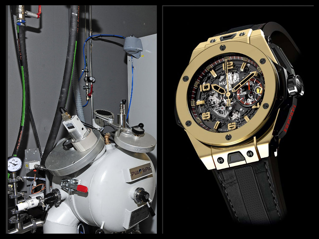 Sono passati gli anni e le tecnologie si sono affinate; le parti di oro fino restano 750 su mille, ma sono cambiati i componenti per ottenere un metallo non solo prezioso, ma sempre più resistente. Hublot, per esempio, ha definito Gold Magic il suo oro che, incorporando ceramica high-tech, è inscalfibile. Lo ha presentato nel dicembre del 2011 mostrando anche il reparto Metallurgia della Manifattura a Nyon, dove veniva realizzata la nuova lega brevettata, frutto degli studi di Hublot e dell’Ercole Polytechnique Fédérale de Lausanne. La durezza di questa lega raggiunge quasi i 1000 Vickers invece dei 400 dell’oro a 18 carati o dei circa 600 degli acciai temprati. A Baselworld 2012 sono poi arrivati i primi orologi, fra i quali il cronografo Big Bang Ferrari realizzato in 500 esemplari con cassa (ø mm 45,5) e lunetta in Magic Gold, fondello in titanio (mille esemplari invece erano tutti in titanio); movimento Unico a carica automatica. Sempre da Hublot alcuni componenti in oro bianco sono trattati PVD nero.