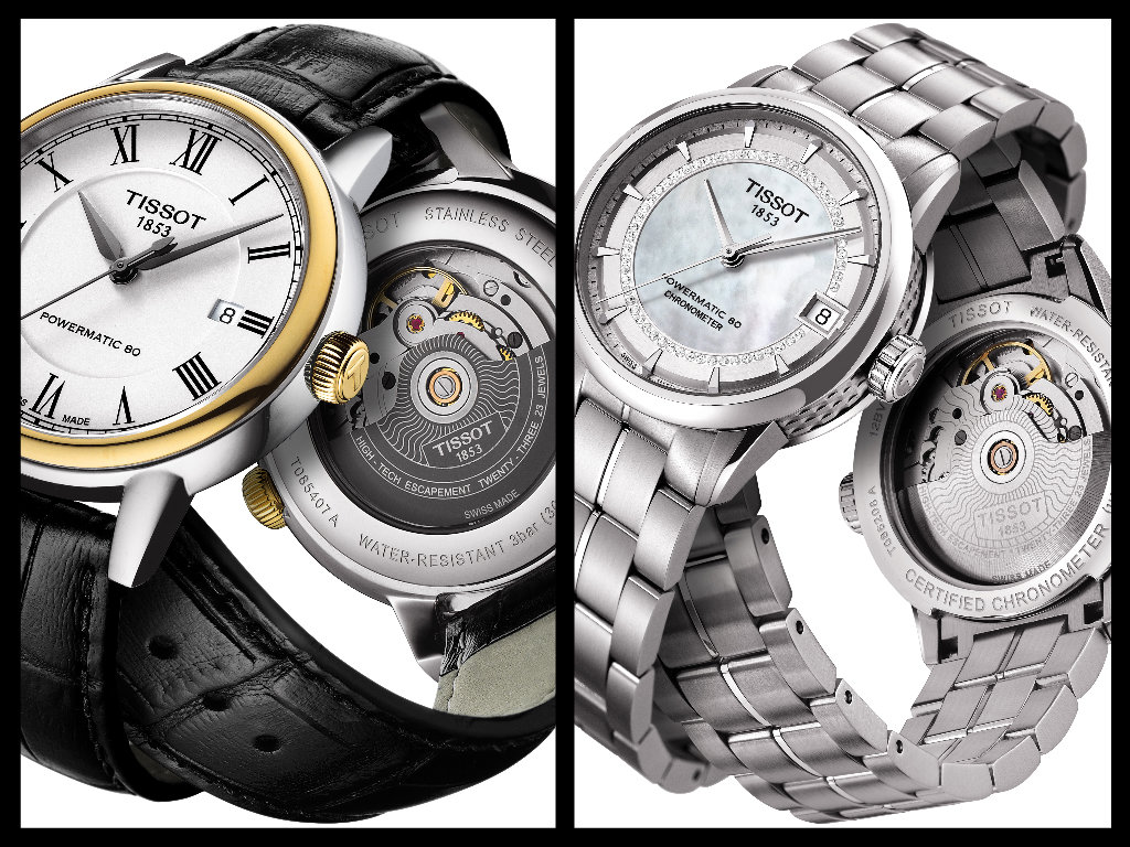 Sotto il profilo estetico massa oscillante e ponte dell’automatico sono decorati a onde. Nelle foto sopra i nuovi Tissot equipaggiati con il Powermatic 80; nella collezione Luxury Automatic i modelli Gent e Lady, con cassa in acciaio 316L dalla carrure decorata sono equipaggiati in alcune versioni con il Calibro certificato COSC. Il Powermatic 80 non certificato COSC equipaggia anche un classico della Maison di Le Locle, il Carson con cassa in due misure: mm39,2 e mm 40.