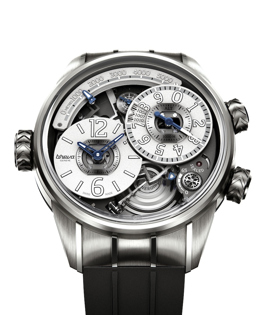 Dopo il Genie 01, proprietà esclusiva di Breva, è arrivata la seconda edizione di questo interessante orologio esclusivamente meccanico. Dotato anche di altimetro, controllabile su una scala che circonda il quadrante, il Genie 01, realizzato in 55 esemplari con cassa ø 44, 7 mm in oro bianco e altrettanti in oro rosa, mostra alle 8 su dischi semitrasparenti ore e minuti mentre i secondi si leggono a ore 12. La riserva di carica è a ore 4, le variazioni della pressione barometrica sono indicate da capsule brevettate da Breva e le informazioni appaiono su un quadrantino ausiliare in pittogrammi. Le tre corone, con doppia estrazione, regolano alle 9 la carica del bariletto e l’indicazione di ore e minuti, alle 4 la pressione dell’aria nelle capsule, aprendole e chiudendole; alle 2 la pressione e il barometro aneroide, un pulsante all’interno regola l’altimetro barometrico. Il movimento è composto da 405 elementi, 46 rubini, frequenza 4Hz.