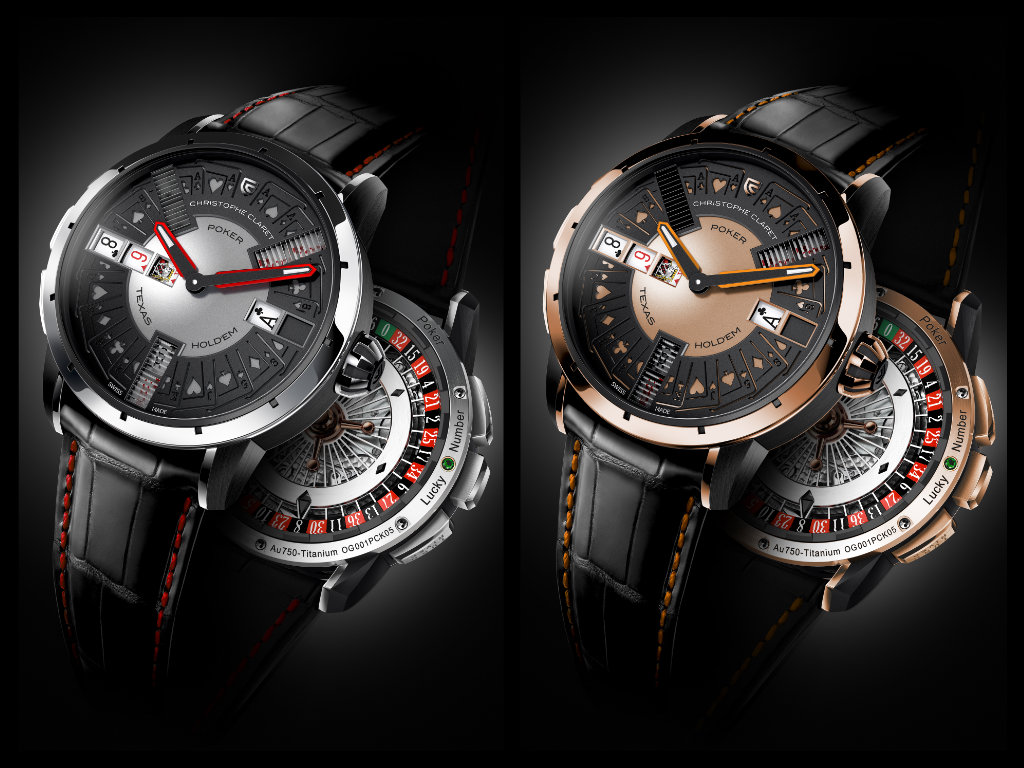 L’ultimo nato è il Poker, anche se questo gioco è stato il primo al quale mr Claret ha pensato. Nel nuovo automatico, che nella cassa di 43 mm ha un movimento composto da 655 elementi (i rubini sono 72 e c’è un doppio bariletto); due i giochi disponibili: il Poker Texas (hold’em) con suoneria dal timbro brevettato, che si ascolta a ogni pressione dei pulsanti, e la Roulette.