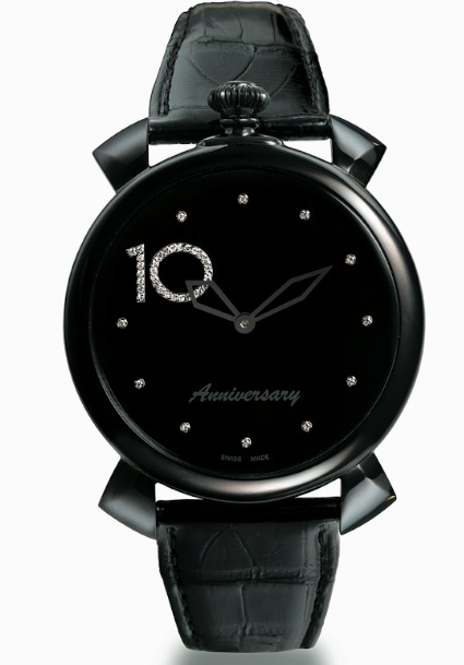 Il Gagà per i dieci anni è infatti quello che pubblichiamo sopra e che sul quadrante mette in risalto la cifra dell’anniversario. È un Manuale sottile, ø 46 mm, spessore mm 7,5. Non tragga però in inganno il nome, è una licenza poetica, infatti il movimento è al quarzo svizzero. La cassa, ø 46 mm è in acciaio trattata PVD nero, il vetro ha trattamento zaffiro, il quadrante nero con indici e il numero 10 in diamanti; Completa il total black il cinturino in alligatore con chiusura deployante. Ne vengono realizzati 110 esemplari; non proprio alla portata di tutti i portafogli (€ 2.500).