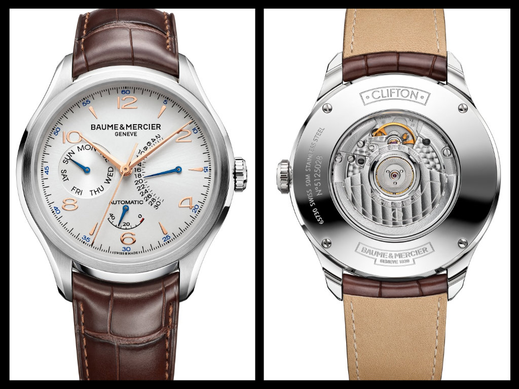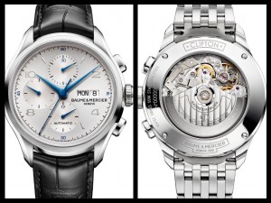 Nella novità Baume&Mercier, presentata al S.I.H.H. 2014, al movimento automatico si affiancano anche l’indicazione del giorno e della data. Ma non si tratta di un semplice day-date, la data infatti è a retrograde e vivacizza il quadrante argenté sul quale spiccano indici dorati. Inoltre c’è anche l’indicazione della riserva di carica. Il cinturino è in alligatore.