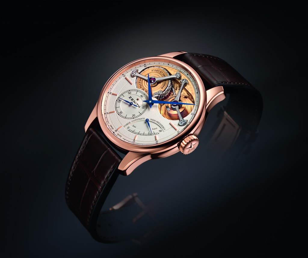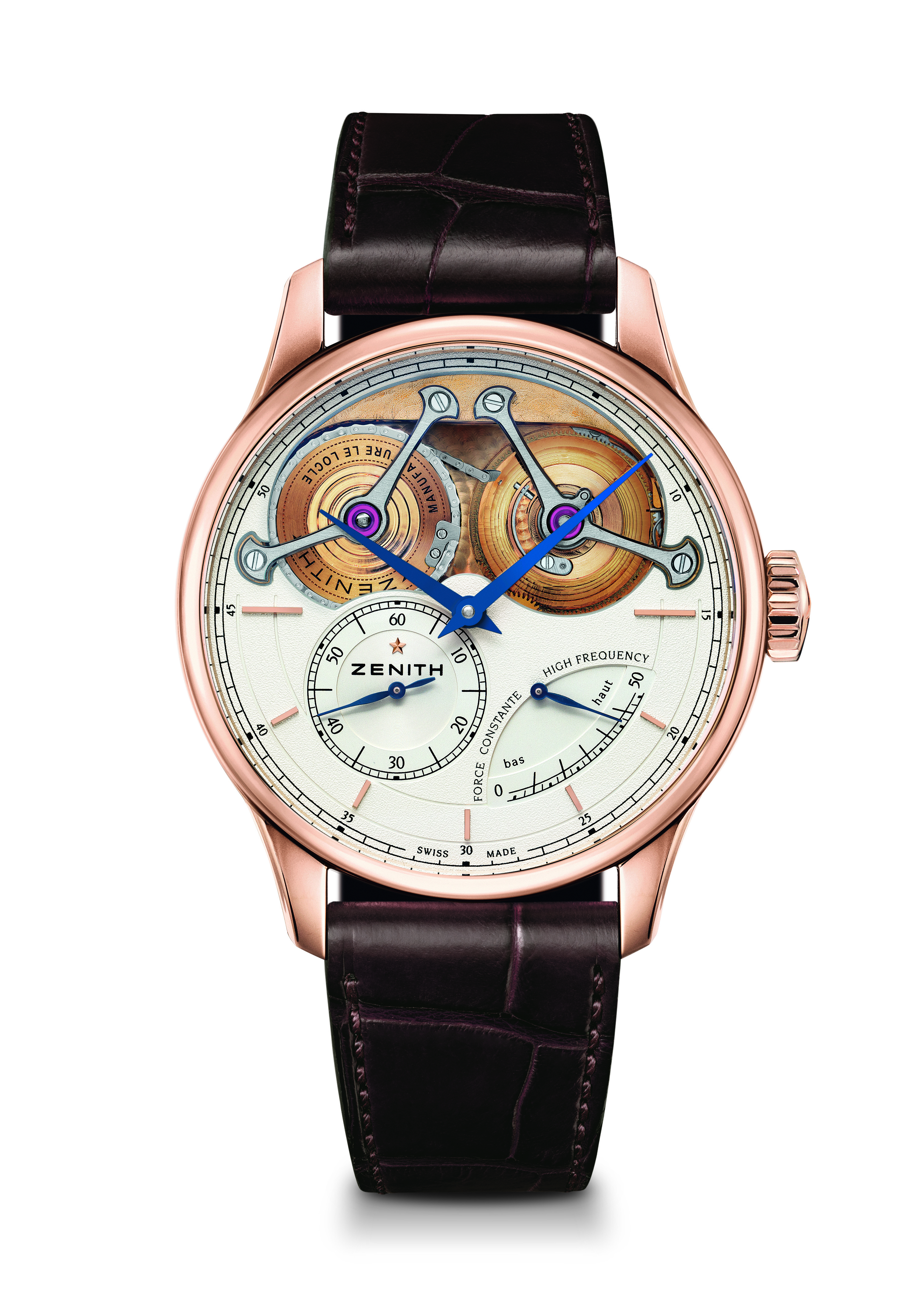 Lo avevamo visto al polso di Aldo Magada, neo CEO di Zenith, durante la presentazione a Milano dello Spindrift Racing. Era semicoperto dal polsino e avevamo promesso di aspettare a parlarne. A prima vista era un signor orologio con la cassa d’oro rosa, ø 45 mm, e un quadrante imponente con le scritte Force constante e High Frequency, insomma un modello adatto a ricordare i primi 150 anni della Marca di Le Locle, star della presentazione a Ginevra in parallelo al SIHH 2015 e poi a Baselwolrd in marzo.