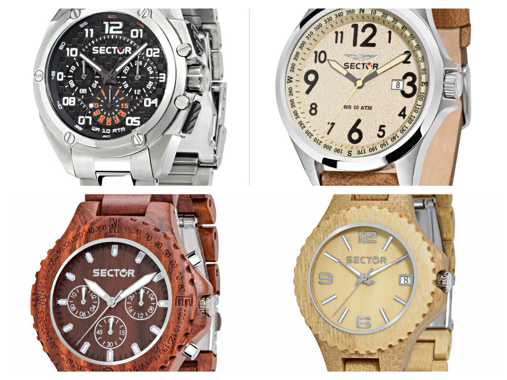 Non mancano poi i tradizionali modelli Sector per uomo realizzati, nella collezione 240, 350, 950 e 180 con dettagli colorati, finiture sportive con lunette girevoli e casse in acciaio anche trattato PVD black, ø da 41 a 45 mm, alcune hanno un look vintage, e con i modelli per i polsi femminili rendono il Marchio interessante per un pubblico ancora più vasto.