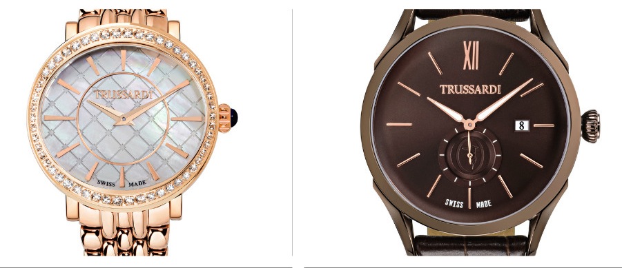 Con il marchio Trussardi arrivano due collezioni Swiss Made al quarzo; una maschile con quattro modelli e una femminile con sette modelli, dedicate rispettivamente a Milano e alla Galleria. Cassa tonda in acciaio ø 44 mm nei segnatempo da uomo che hanno richiami vintage con le anse arcuate e i piccoli secondi; la corona innovativa è una mezza onion e nei modelli femminili Galleria ha una pietra azzurra a cabochon metre il logo ovale del Levriero si combina con la cassa tonda ø 38 mm, anche impreziosita con topazi naturali e quadranti guilloché.