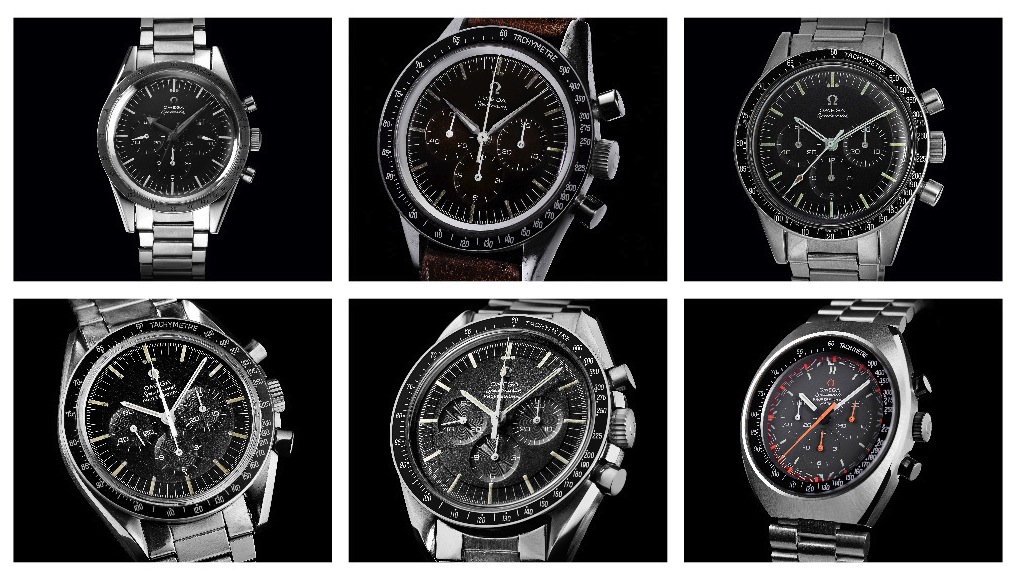 Sei fra gli Speedmaster più noti , in senso orario il primo, poi le Ref.CK2998, ST105003, ST145012, ST145022 e lo Speedmaster Mark II con la cassa tonneau