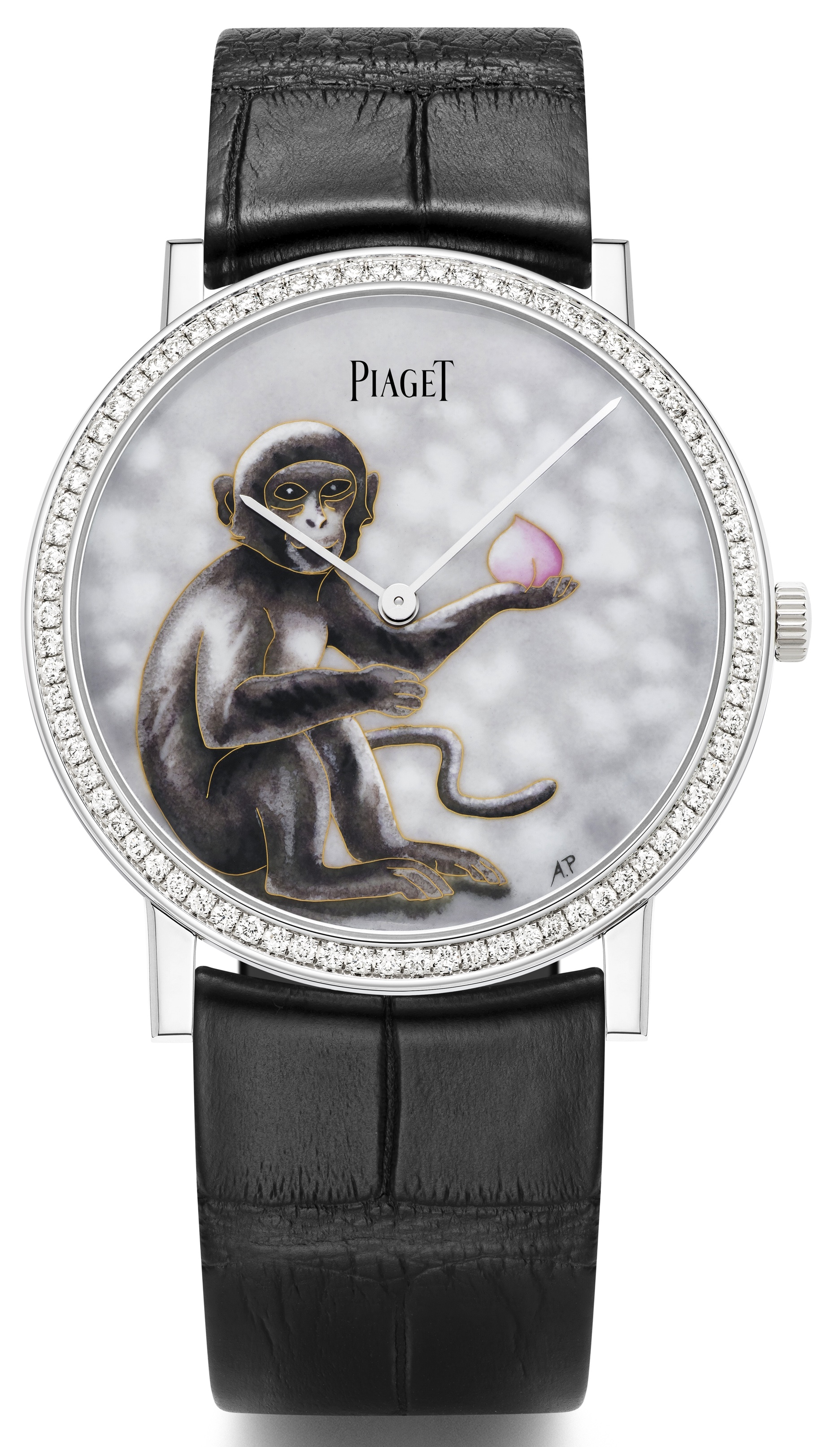 Nella collezione Arts & Excellence Piaget dal 2012 sceglie per un orologio in tiratura limitata, il simbolo dello zodiaco cinese: per il 2016, anno della scimmia, l’Altiplano ø 38 mm in oro bianco, ha una lunetta impreziosita da 78 brillanti e il quadrante Grand Feu in smalto cloisonné. Anita Porchet, artista famosa per l’originalità dei suoi dipinti s smalto ha interpretato in maniera molto personale la scimmia, cogliendone una simpatica espressione e completandola con una pesca che, nella cultura cinese, rappresenta l’immortalità. Il movimento di Manifattura è il Calibro 430P ultrasottile a carica manuale. Realizzato in 38 esemplari questo Altiplano è venduto solamente nelle boutique Piaget