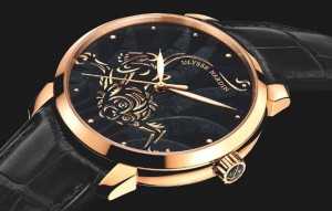 White gold Piaget Altiplano with diamonds and Ulysse Nardin Classico have been dedicated to Chinese new year. On Piaget enamelled cloisonné dial artist Anita Porchet, together with the monkey, has painted a peach, fruit of immortality while Ulysse Nardin with rose gold case has a black dial like a modern painting, a comic strip like, you have to look at it carefully before seeing the monkey. Both have self-winding movements.