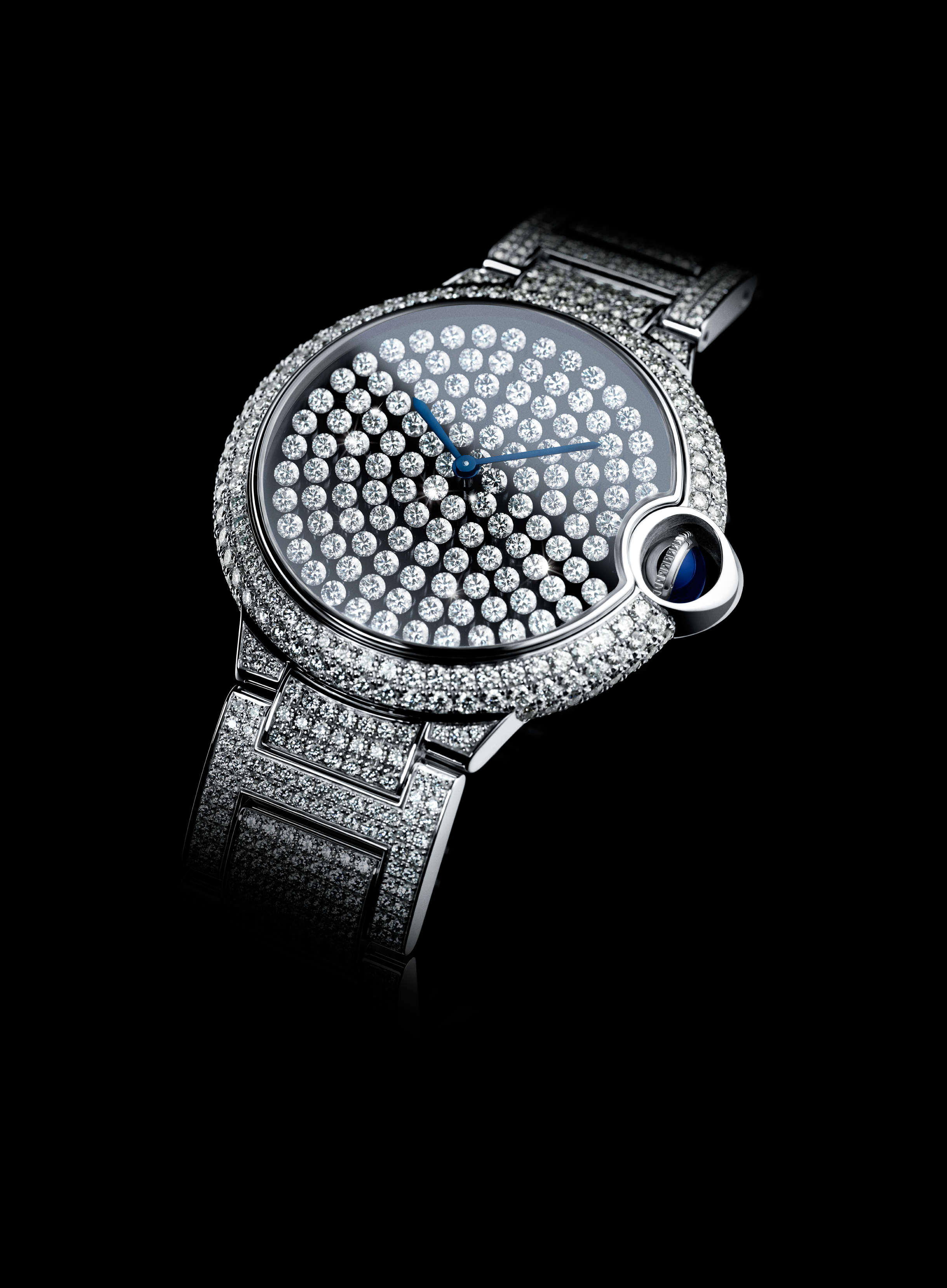 CARTIER nuova la collezione Clé con la corona che gira come una chiave; diamanti che vibrano nel Ballon Bleu de Cartier. Avete presente come si agitano le App su Ipad e telefonini? bene lo stessa impressione la danno 132 diamanti quasi a pavé sul quadrante, ognuno è incastonato in una spirale che ondeggia ad ogni movimento.
