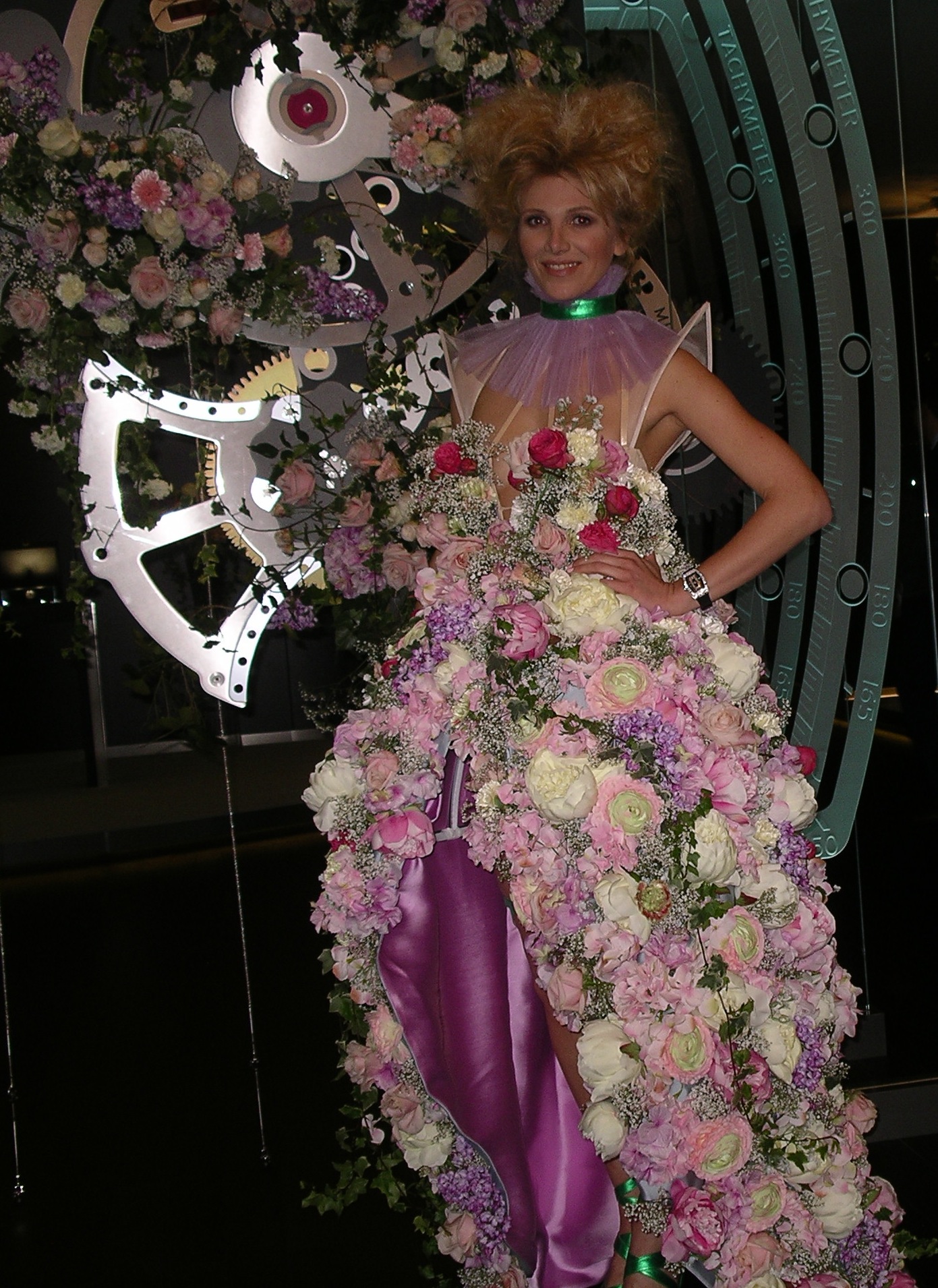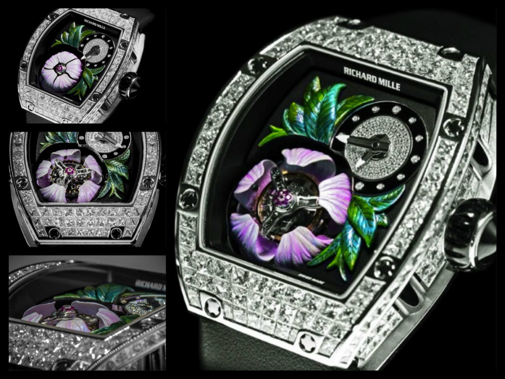 RICHARD MILLE: marchio maschile per antonomasia, ha realizzato un Tourbillon Fleur che alla romantica creatività affianca un eccezionale padronanza tecnica (doti di Giulio Papi e del suo team). Sul quadrante in onice con ore decentrate, spicca, nell’angolo opposto, una magnolia cinese con cinque petali che, a richiesta, si aprono in 5 secondi; all’interno come un pistillo si alza, per un millimetro, il tourbillon volant; 5 secondi anche per la chiusura. L’intero stand è stato decorato con composizioni floreali (persino gli abiti botticelliani di due mannequin nel primo giorno, con toni più moderni, purpurei, nel secondo; d’altro canto si sa, soprattutto le rose durano lo spazio di un mattino).