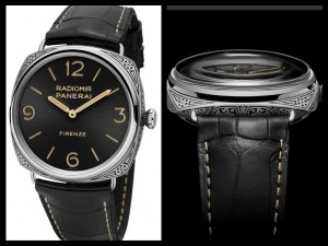 Panerai è anche Marca per collezionisti e lo ha dimostrato l’Asta parigina di dicembre. Così partiamo dalle edizioni limitate. In dicembre è stata inaugurata la boutique fiorentina, ampliata e ristrutturata, non poteva quindi mancare una “special edition” venduta solo in quella boutique: è un Radiomir in acciaio satinato AISI 316L, ø 47 mm come il primo Radiomir degli anni ’30; su cassa e lunetta incisioni che riprendono, con un artistico lavoro a bulino, motivi della città del giglio; il movimento è il Calibro manuale P.3000, realizzato interamente in house, i due bariletti in serie garantiscono un’autonomia di tre giorni, le A/h sono 21.600; il modello sub a 100 m. è realizzato solo in 99 esemplari.