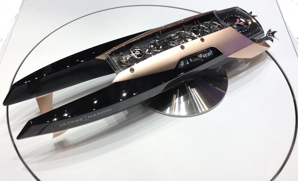Ha destato molta curiosità il SuperCat Concept, originale orologio da tavolo esposto nello stand, che sintetizza la passione di UN per il mare e per la ricerca tecnologica. A prima vista sembra un giocattolo; lungo cm.35, è stato realizzato con materiali d’avanguardia da uno dei giovani orologiai della Manifattura che si è ispirato al catamarano da gara Artemis Racing. Un abitacolo in resina trasparente protegge il movimento lineare UN-910 con 8 gg d carica, motore dell’imbarcazione, che è azionato da due propulsori celati nello scafo dove sono alloggiate le corone di carica e regolazione; la platina forma il ponte della barca, i ruotismi trattati PVD black sono tenuti da ponti a forma di frecce; due i fusi orari – ore saltanti e minuti – su due coni; riserva di carica in giorni e ore su due contatori.