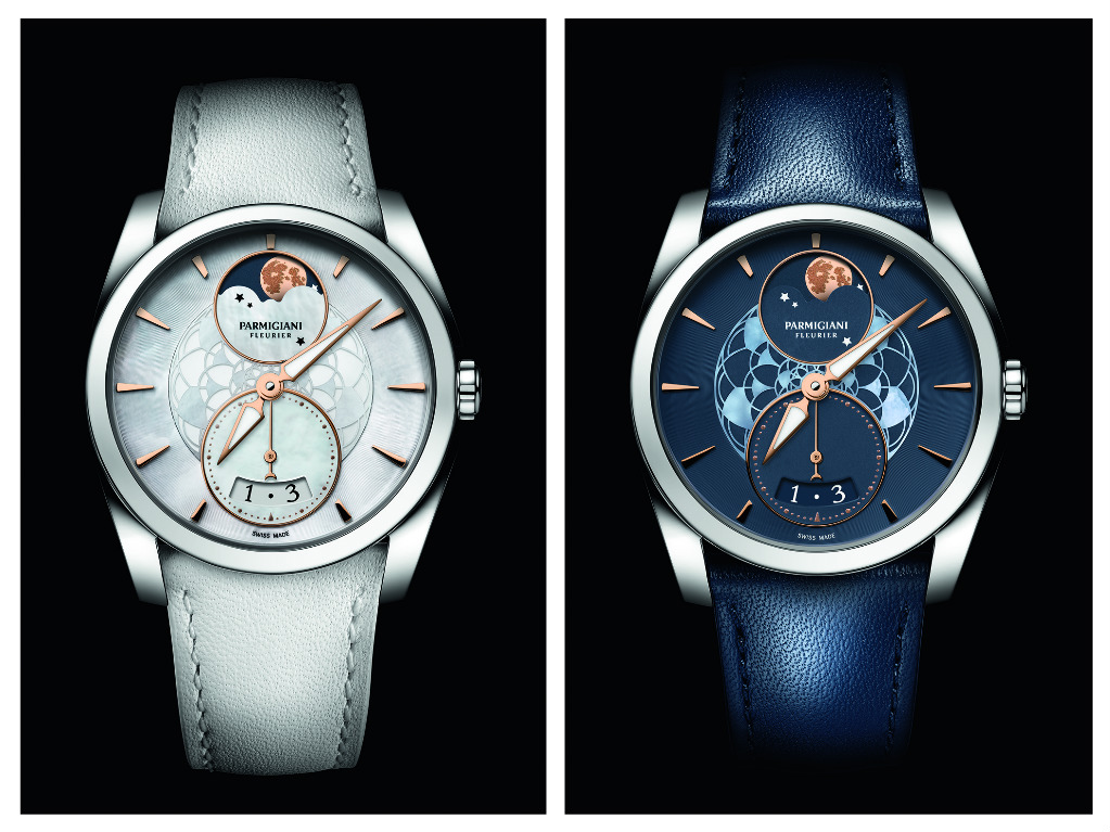 Per il pubblico maschile, che sicuramente rappresenta la percentuale maggiore dei clieni Parmigiani, l’orologio del ventennale è il Tonda Chronor Anniversaire con il primo movimento cronografico integrato della Maison. Un traguardo nella tecnica orologiera con il Calibro PF361 rattrappante a carica manuale e gran data. Realizzato in oro e decorato secondo la migliore tradizione orologiera, questo movimento presenta una particolarità, sul tamburo del bariletto mostra in rilievo il profilo di Michel Parmigiani; le A/h sono 36.000, pari a 5 Herz, indica il decimo di secondo senza moduli aggiuntivi e ha due ruote a colonn (la seconda governa la lancetta sdoppiante), inoltre la cronografia è a innesto verticale e il bilanciere è agganciato in due punti a un ponte passante; integrato anche il sistema della gran data che dispone di due dischi ø 13 mm. Il quadrante è bianco o blu Navy, una nuova sfumatura nella tavolozza cromatica dell’azienda, cassa in oro bianco o rosa ø 42,10. Sempre fra i Tonda 1950 nella sezione Alta orologeria, il tourbillon Galaxy, 5 esemplari numerati sul fondello della cassa in oro rosa; l’estetica del quadrante in avventurina blu ruota intorno all’asse delle ore 07-8, un dettaglio che può anche sfuggire, ma che è stato ideato perché corrisponde all’ora della nascita di Michel in Val de Travers. Quanti anni fa? Non molti e poi non è tanto l’età anagrafica che conta, ma quella mentale (lo dico per esperienza personale…).