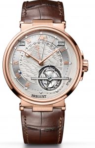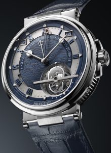 A Baselworld Breguet ha presentato in prima mondiale, nella collezione Marine, la Ref.5887, un Gran Complicato, che oltre all’Equation Marchante ha l’indicazione riserva di carica (80 ore), il calendario perpetuo (con datario a retrograde) e lo scappamento a tourbillon. (la ruota scappamento è in silicio, l’ancora laterale invertita con corna in silicio ed è in silicio anche la spirale). Il tourbillon è un omaggio a Abraham Louis Breguet, appassionato di cronometria e orgoglioso per essere stato nominato, nel 1814, membro del Bureau des Longitudes di Parigi, che si occupava di astronomia e dei suoi riflessi su geografia, navigazione e fisica del globo. Breguet, che si occupava soprattutto di cronometria ed era l’unico orologiaio nel Bureau, divenne un punto di riferimento per il calcolo della longitudine in mare. Infatti il 27 ottobre 1815 il Re Luigi XVII lo nominò Horloger de la Marine Royale, qualifica che oggi ritroviamo incisa sul fondello del Breguet Ref,5887.