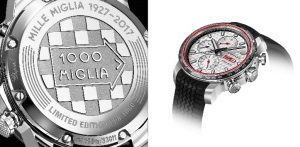 Il cronografo automatico Race Dition in mille esemplari certificati cronometro, ø 44 mm w.r. m.100, ha dettagli che si collegano al mondo dei motori, compreso il cinturino ispirato alle Dunlop; la lunetta ha inserti in alluminio nero, il fondello con il logo e la dicitura della 90^edizione. Non c’è l’edizione in oro, risultato dei tempi, ma per un evento sportivo come la Mille Miglia, l’oro è un di più, meglio l’acciaio.o l’acciai e l’oro rosa.