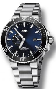 L’Aquis piccoli secondi data ref 743 7733 cassa in acciaio ø mm 45,50 con fondello a vite w.r. a m. 500, lunetta girevole unidirezionale con inserto in ceramica nera, scala sessagesimale dei minuti e indicatore dello zero, movimento automatico Cal.Oris 743 su base Sellita cal.200-1. Quadrante nero con piccoli secondi al 9 e data al 3, indici con Superluminova, lancette ore e minuti in nichel luminescenti, lancetta secondi in nichel con Superluminova su un solo lato. Cinturino in caucciù blu o nero o bracciale in acciaio.
