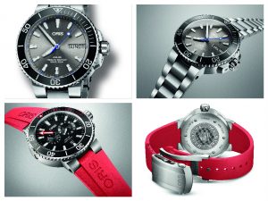 L’Aquis Date con data al 6 ref 733 7730 ha la cassa in acciaio ø 43,5 mm fondello con oblò in cristallo minerale, corona a vite protetta; è w.r. a m.300 e la lunetta girevole unidirezionale (più facile da azionare) ha inserti in ceramica nera, scala sessagesimale e indicatore dello zero in Super-LumiNova®, quadrante blu o nero con imdici e lancette luminescenti, movimento automatico cal. Oris 733; bracciale o cinturino in caucciù blu o nero. Infine il Regulateur Meistertaucher o Master Diver Ref.749 7734 con movimento cal.Oris 749 su base Sellita 220-1 ha il quadrante nero con minuti centrali, ore su quadrantino al 3 e piccoli secondi al 9, cassa in titanio w.r. a m.300 con protezione corona a vite e pulsanti, fondo in acciaio con incisione, valvola per il gas elio, lunetta girevole unidirezionale con inserti in ceramica; cinturino in caucciù rosso o bracciale in titanio. La confezione comprende il cinturino in caucciù e gli strumenti per il cambio del bracciale.