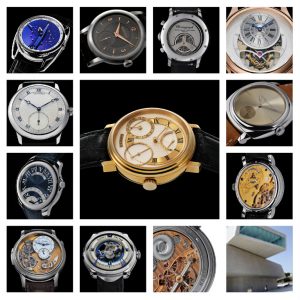 Sopra, da sinistra a destra orologi di P.Dufour, H.Asaoka, C.Claret, L.Ballourd, De Bethune, L.Ferrier, R.Gauthier, V.Halter, C.Klings, JD,Nicolas, R.W.Smith, K.Voutilainen; al centro G.Daniels e infine il museo d’arte contemporanea
