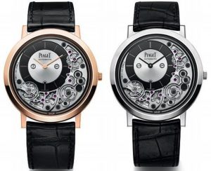 PIAGET: Il sessantesimo anniversario dell’Altiplano si conclude – almeno per ora – con un eccezionale movimento automatico extrapiatto studiato nella Manifattura ginevrina da più di tre anni. L’Altiplano Ultimate Automatic, cassa in oro bianco o rosa ø 41 mm, ha uno spessore di 4,30 mm. Come per il Calibro 900P anche per l’attuale 910P cassa e movimento vivono in simbiosi; la cassa è infatti anche la platina e la micromeccanica ha fatto sì che i 219 componenti portassero a un risultato eccezionale. Per gli amanti delle cifre ricordiamo che alcune ruote hanno uno spessore di mm 0,12 contro i tradizionali 0,20. La massa oscillante periferica è in oro 22 carati, i rubini sono 30, le A/h 21.600; l’intera architettura del movimento è visibile e accresce il fascino di un orologio d’eccezione che ha posto le lancette al di sotto del livello dei ponti perché non possano mai interferire con il cristallo zaffiro. Per i polsi femminili la scelta dell’anteprima è caduta su un modello con precedenti diremmo storici, un Piaget degli anni ’60 posseduto da Jackie Kennedy Onassis e riacquistato dalla Maison trent’anni più tardi; la cassa ovale orizzontale è impreziosita con diamanti, ma ciò che è davvero stupendo è il bracciale in oro lavorato come un preziosissimo tessuto.