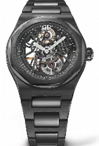 GIRARD-PERREGAUX: un’icona della Marca di La Chaux-de-Fonds, il Laureato, presenta in ceramica nera sia la cassa ø 42 mm sia il bracciale; il movimento automatico è il Calibro GP01800 scheletrato anche nel rotore che è in oro rosa; i 273 componenti presentano un finitura anglage o sono trattati PVD nero, 28.800 le A/h, 25 i rubini; il fondello è in vetro zaffiro, sul quadrante un anello reca gli indici.