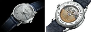 Per la prima volta al SIHH De Witt ed Hermès. Il primo esporrà, fra l’altro, l’Academia Endless Drive con un nuovo quadrante dalla vite elicoidale che ruota al centro, collegata al sistema della riserva di carica di 59 ore, il movimento automatico su base DeWitt 505 è sviluppato, fabbricato e assemblato a mano; ore e minuti sono indicati da due dischi alle 9 e alle 3, La cassa ø 42,5 mm affianca oro rosa e caucciù senza dimenticare le colonne napoleoniche. Del secondo un cronografo automatico, l’Arceau, disegnato da Henry d’Ordigny nel 1978, quando la Maison parigina aprì uno stabilimento in Svizzera dove produrre gli orologi, e che oggi festeggia il suo 40° anniversario con. cassa è in titanio, ø 41 mm, e quadrante nero.