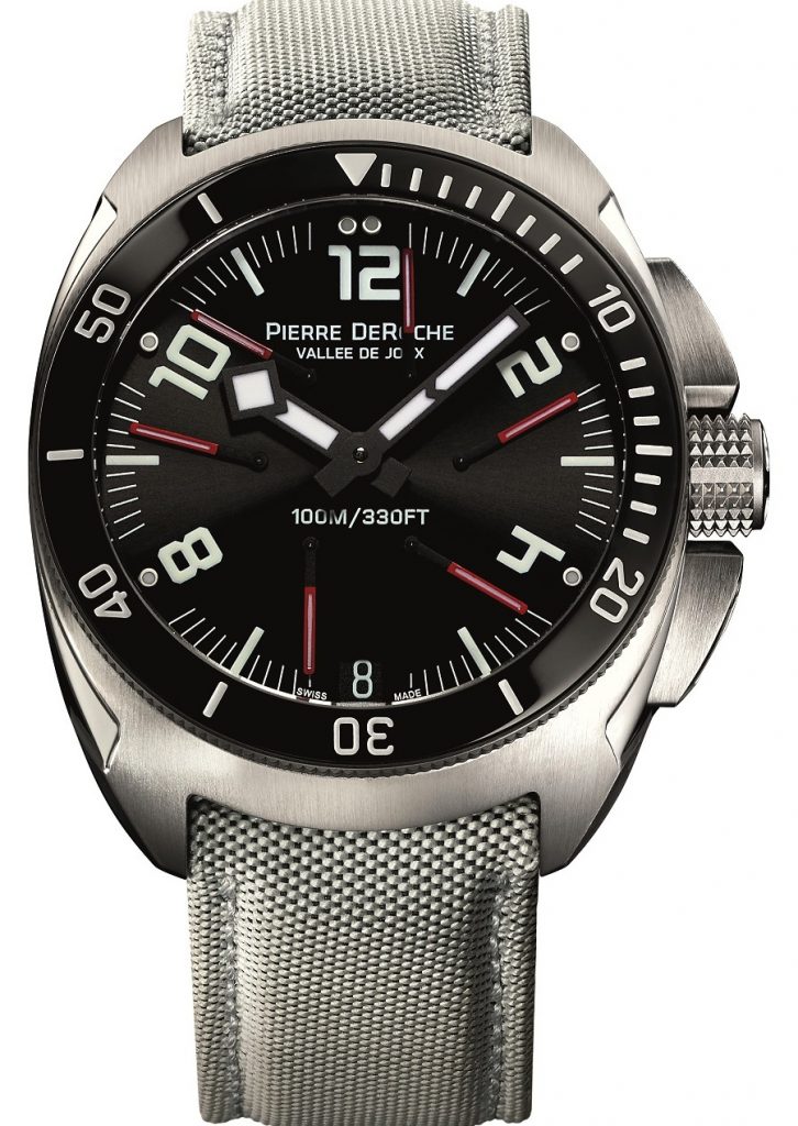 Il nuovo orologio è il GrandCliff 1004 Royal Retro, dalla cassa in titanio grado5 modificata ø 43,5 mm w.r. a m.100 (designer Octavio Garcia) e lunetta girevole in ceramica; per la prima volta il Grand Cliff è dotato di un quadrante nero tradizionale con indicazione dei secondi a retrograde su sei settori di 10″ ciascuno; da notare che il numero scelto per la novità è composto dai dieci anni e da 04, il numero che distingue il meccanismo ideato per il movimento esclusivo di Dubois-Depraz, infine 1004 è anche l’altezza sul mare del lago di Joux. Dal fondo in vetro zaffiro si ammira il movimento automatico con massa oscillante decorata, ponti a anglage e 58 rubini. La tiratura è limitata a 201 esemplari:
