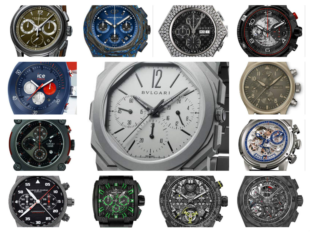 In pole position abbiamo messo uno degli orologi che più ci piacciono, l’Octo Finissimo di Bvlgari, gli fanno corona da sx a dx Chopard L.U.C. Chrono One flyback, Girard-Perregaux Laureato Absolute Chronograph, Greco Genève Racer Time RT.008, Hublot Classic Fusion Ferrari GT 3D Carbon, Ice-Watch Pierre Leclerc Dark Blue, IWC Schaffhausen Pilot’s Watch Chronograph Top Gun, edizione Mojave Desert, Longo X Racer, Louis Moinet Chronosphere, Maurice de Mauriac Zurich Double Sixty Chronograph rattrapante, Rebellion Timepieces R.E 1 2.0 Chronograph Green Edition, TAG Heuer Carerera Tourbillon Nanograph, Zenith El Primero 21 Carbon