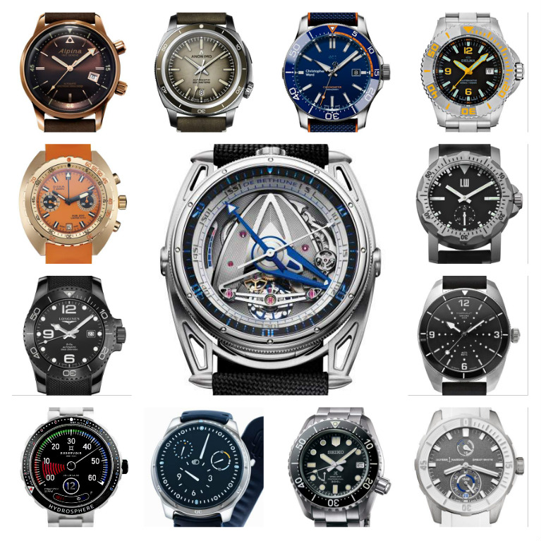 Abbiamo messo al centro il De Bethune, 5 gg di carica, anche se ci siamo stupiti della sua iscrizione: è il primo orologio sportivo DB e ha un calibro nuovo, però essendo w..r. a m.100 si trova a competere con altri molto più agguerriti sotto questo profilo. Seiko ha ringiovanito i Prospex anche nel logo.