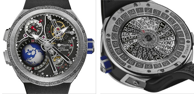 La cassa in titanio ø 45 mm, presenta una forma inedita, vista dall’alta è rotonda, ma guardandola da altre posizioni come nella prima foto pubblicata, appare ovoidale con una tendenza arcuata; anse e cinturino sono integrati sulla lunetta le cui incisioni rimandano alla filosofia dei due Maestri orologiai; il vetro zaffiro ha forma ovoidale. Nel nuovo movimento di Manifattura con ponti e platine in titanio, un ponte ad arco sospeso fa vedere ore e minuti e altrettanto originale à la protezione del Tourbillon 24 secondi infine su un globo tridimensionale si vede l’ora universale.