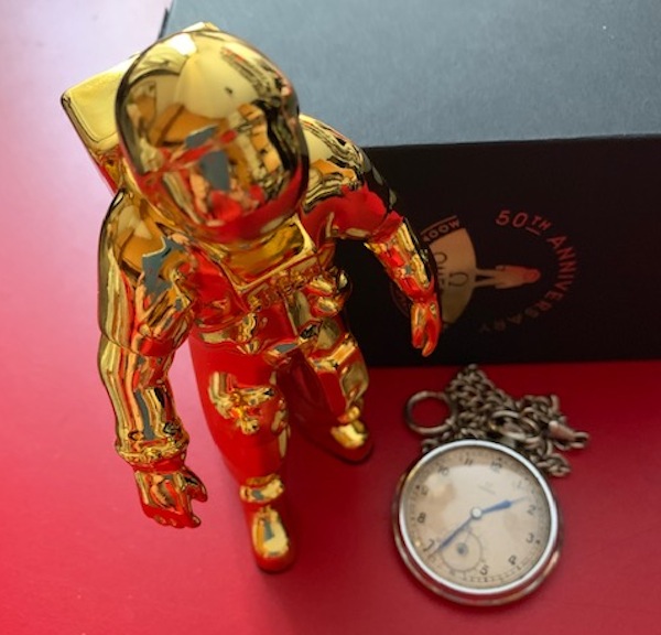 Mio nonno, classe 1881, era molto affezionato a un Omega in acciaio, anche se nel tempo, divenuto direttore di un importante stabilimento famaceutico aveva potuto permettersi segnatempo più esclusivi, alternando le sue scelte fra due marchi: Omega e Longines, allora i preferiti dalla borghesia lombarda; il mercato non era ancora stato invaso dai Rolex, i Patek Phiippe erano oggetti di un altro pianeta così come i Vacheron Constantin o i Piaget. Ma nella foto, a conclusione di questo secondo omaggio allo Speedmaster più famoso, un Tasca del secolo scorso e la riproduzione di un astronauta si fanno buona compagnia.