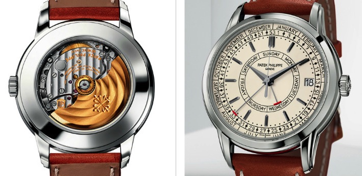 D’obbligo partire con le due novità maggiori, anche se altri modelli sono tra i nostri preferiti; per esempio ci siamo innamorati della Ref.5078, una Ripetizione minuti con movimento automatico, vista di sfuggita, dal magnifico quadrante in smalto decorato ad arabeschi neri su fondo scuro, ma la foto non era al momento disponibile. Nel mondo del lavoro conoscere il numero della settimana è importante per programmare ordini e consegne, questa indicazione che mancava, è stata inserita nella Ref.5212, unico Calatrava in acciaio prodotto attualmente; il movimento automatico Calibro 26-330, visibile dal fondello in vetro zaffiro, è stato migliorato nelle prestazioni di base. Sul quadrante una lancetta a martello con la punta rossa indica il giorno, mentre un’altra mostra il numero della settimana in corso e il mese; la data è a ore 3.