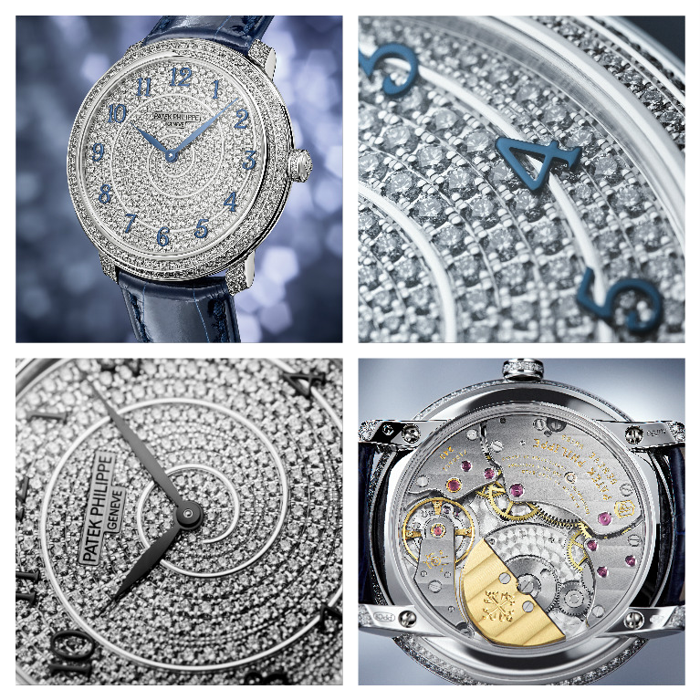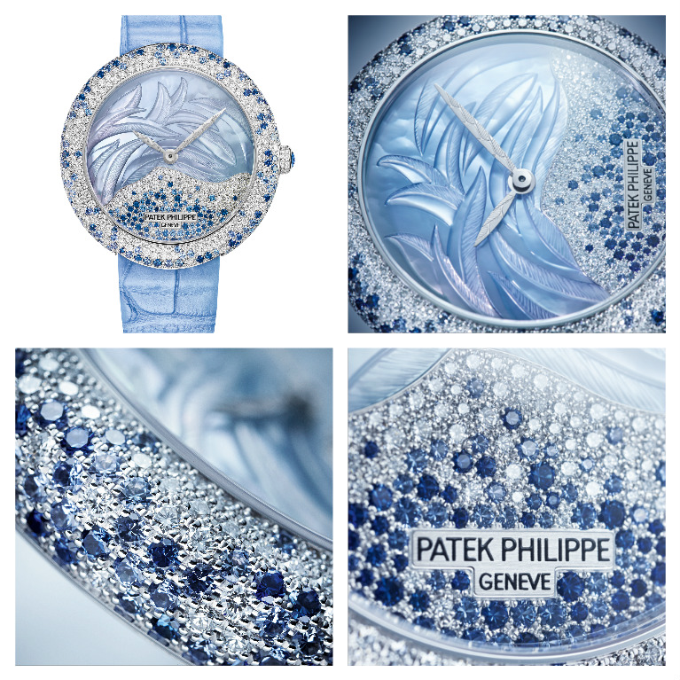 Passando ai modelli d’alta gioielleria la Ref.4889/901G è un Calatrava con quadrante in madreperla incisa e impreziosito con 98 diamanti e 89 zaffiri blu, analoghe pietre anche su cassa, corona e fibbia, in totale i diamanti sono 348 e 354 gli zaffiri blu; Il movimento è il Calibro 240 automatico ultrapiatto.