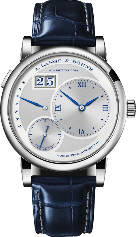 Il Lange 1 Day-Matic, realizzato in 25 esemplari, è in oro bianco (cassa ø 39,5 con oblò in vetro zaffiro sul fondello e quadrante argento) caratterizzato da dettagli blu e dal giorno della settimana indicato a retrograde sul quadrante, che è speculare al classico modello Lange 1 carica manuale, con ore e minuti a destra e secondi continui e data a sinistra. Il movimento è il Calibro di Manifattura L021.1, riserva di carica 50h;