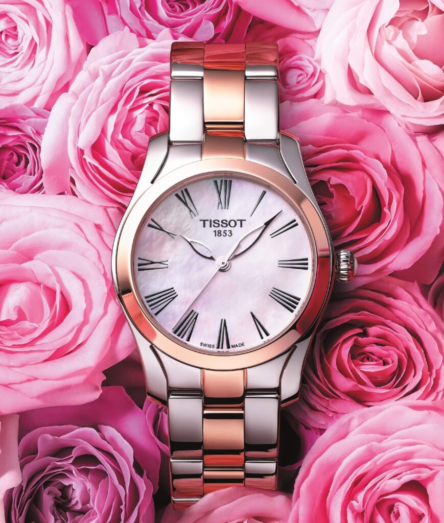 Partiamo quindi con il nuovo T-Wave Tissot che ha scelto il look bicolore dell’acciaio e dell’oro rosa PVD per la lunetta e la maglia interna del bracciale, che ben si sposa al fiore dell’amore per eccellenza, in una tonalità molto femminile. Però è disponibile anche la versione in solo acciaio 316L. Questa la carta di identità: ovviamente Swiss Made, cassa ø con movimento al quarzo con EOL (End Of Life), cassa o 30 mm, w.r. 30 m.