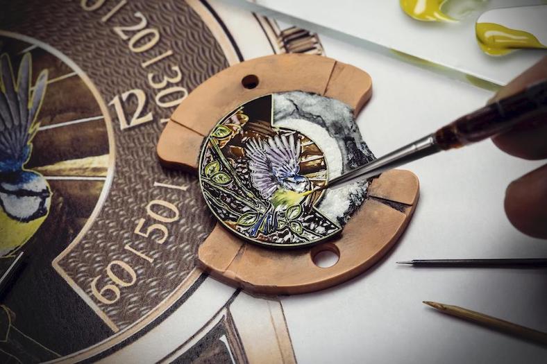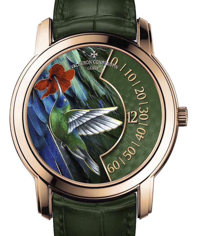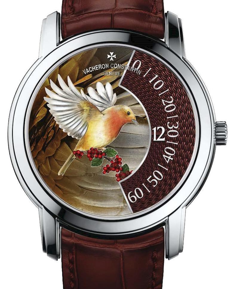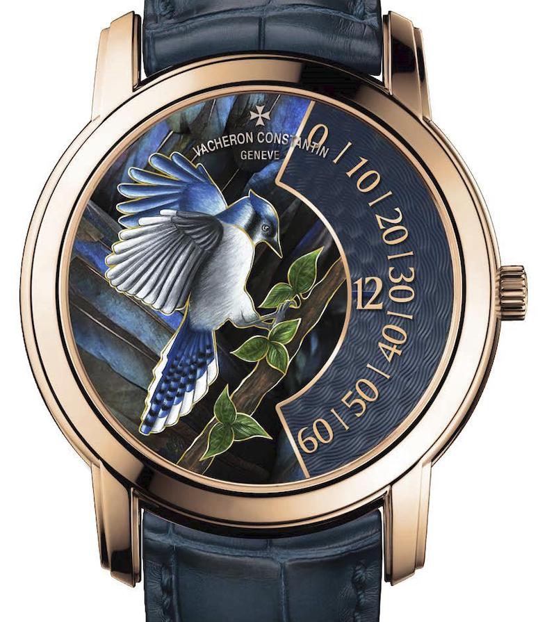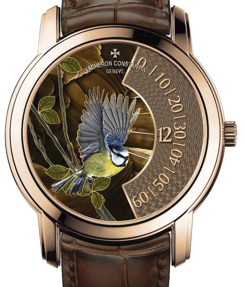 I quattro segnatempo, definiti “singing birds” (uccelli canterini) potrebbero trarre in inganno perché di primo acchito si pensa agli automi e alle melodie che sono il fiore all’occhiello dei segnatempo di Jaquet-Droz con gli automi, mentre i quattro esemplari di Vacheron Constantin non cantano, ma sembrano farlo con i cromatismi variegati delle loro piume. Nel panorama degli esemplari disponibili gli artigiani-artisti hanno scelto una base di 10 colori e infinite sfumature, per ritrarre nella parte in alto del quadrante d’oro che si sviluppa su due livelli, il colibrì, la ghiandaia blu, la cinciallegra e il pettirosso; la tecnica impiegata è quella degli smalti champlevés mentre lo spazio a destra è decorato con un motivo guilloché sul quale spiccano le ore e i minuti a visualizzazione continua.