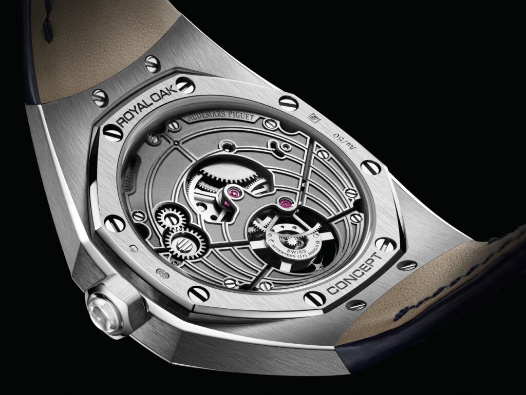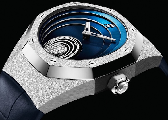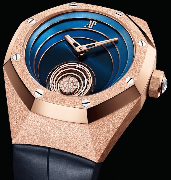 Questa estate ai molti modelli femminili, si è aggiunto il Royal Oak Concept Gold Frosted Flying Tourbillon. Un segnatempo che per la cassa ø 38,5 mm in oro bianco o rosa, impiega la tecnica fiorentina dell’oro martellato, ripresa dalla designer di gioielli Carolina Bucci, mettendone in risalto l’aspetto definito “ghiacciato”. Ancora più innovativo il quadrante, senza indici, ideato con quattro cerchi dalle sfumature blu che partono dalla gabbia del tourbillon e, disposti su più livelli, offrono una profondità mai vista prima; infine la gabbia del tourbillon presenta un nuovo disegno con cerchi color oro e diamanti taglio brillante.