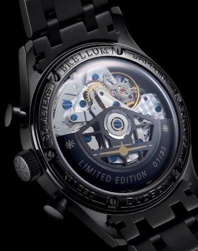 Visibile dal fondo in vetro zaffiro il Calibro automatico Brellum BR751-PR su base Valjoux 7750 modificata e certificata cronometro; il rotore trattato DLC è decorato con il logo della Marca e la sagoma di un aeroplano.