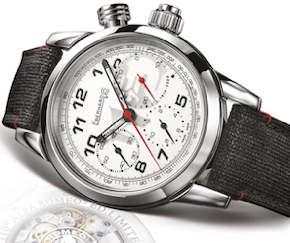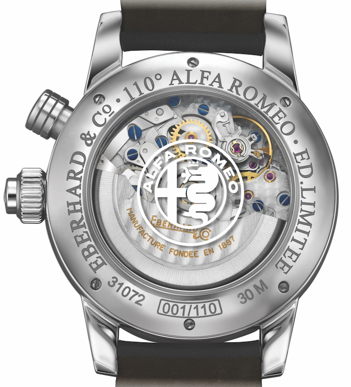 Grazie agli ottimi rapporti tra Eberhard&Co e Alfa Romeo, sono stati diversi i segnatempo dedicati alle automobili o a momenti indimenticabili delle vittorie dei suoi piloti, primo fra tutti Tazio Nuvolari che ha dato vita a una ricca collezione. Non poteva quindi passare inosservato il 110° anniversario dell’Alfa Romeo, per il quale è stato realizzato un cronografo in tiratura limitata a 110 esemplari. La cassa in acciaio ø 42 mm, spessore, 13,45 mm, ha una lunetta lucida e accoglie un movimento automatico con dispositivo azzeramento della cronografia tramite pulsante (la cui forma cilindrica ricorda un pistone) coassiale alla corona a ore 3; A/h 28.800, amagnetico, antichoc, bilanciere “glucydur”; molto curate le finiture con viti blu, rubini con incisione circolare dorata, massa oscillante con decoro personalizzato e finitura Côtes de Genève; ponte del crono con identica finitura, mentre i ponti inferiori sono decorati a perlage. Sul fondo in vetro zaffiro, serrato con 6 viti e personalizzato dall’incisione “110° Alfa Romeo”, il logo Alfa Romeo al centro, è di colore bianco. Il quadrante argenté ha lancette a bastone scheletrate con inserto luminescente nero, i tre tradizionali contatori, la scala tachimetrica sulla circonferenza e alle 3 il logo dell’anniversario.