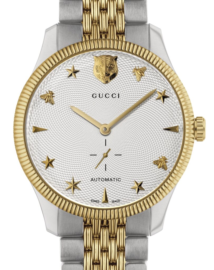 Gucci Timepieces unveils new G-Timeless watches, steel case ø 38 mm and dials green-red-green embroidered with silver bee, imperial symbol born in France; self-winding versions have Brand symbol on the dial, steel case ø 40 mm PVD gold bezel and bracelet.
