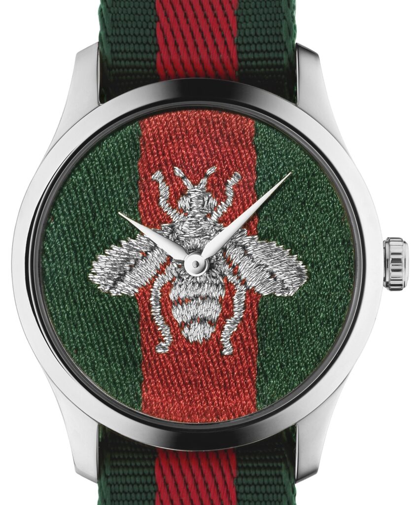 Sui nuovi orologi G-Timeless di Gucci Timepieces, lanciati questa estate, il quadrante in nylon rosso-verde è impreziosito dal ricamo delle api argentate.