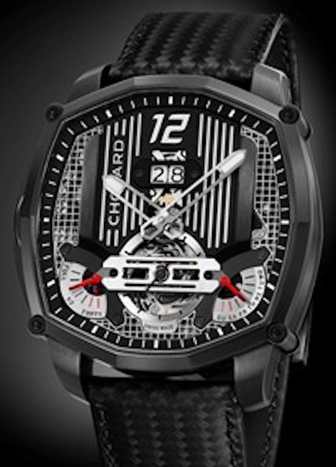 Questo Concept Watch, certificato cronometro dal COSC, presenta molti dettagli interessanti a partire dal quadrante lavorato come la griglia di un motore, la cassa a cuscino, ø 48,6×46 in titanio (come la corona verticale a ore 9) ha la carrure microbillé con anse e lunetta lucide, e viene poi sottoposta a trattamento DLC. Il movimento di forma è il nuovo Calibro automatico di Manifattura Chopard 04-03M (dotato di scappamento a tourbillon) per il quale sono stati depositati dei brevetti (per il meccanismo di arresto del tourbillon che regola la precisione al secondo e per il bilanciere Variner per garantire una marcia stabile compensandone le variazioni di inerzia), i rubini sono 43, le A/h 28.800. La finitura cromatica si riallaccia ai motori, dal grigio del ponte del tourbillon all’antracite e al nero del rotore. Sul quadrante nero opaco la data è digitale, alle 4.30 l’indicazione dei giorni a retrograde e alle 7.30 quella della riserva di carica (circa 60 h), Il cinturino è in carbonio con fodera in caucciù. Questo Concept Watch è riservato alle boutique Chopard e la tiratura è limitata a 20 esemplari.