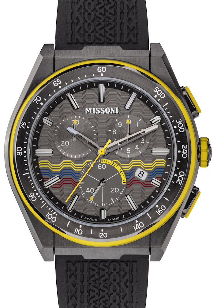 Solo tempo o cronografi nella collezione Missoni 331 modelli solo tempo o cronografi, ne pubblichiamo uno, foto sotto, con movimento al quarzo SM 927 Swiss Made e cassa ø 44,5 mm in acciaio o IP gun o champagne; sui quadranti motivo a onda in colore a contrasto che ritroviamo anche sul bracciale mentre sul cinturino in gomma c’è il “lettering” della Marca; sulla lunetta inserti in gomma colorati che decorano anche i pulsanti e la corona.