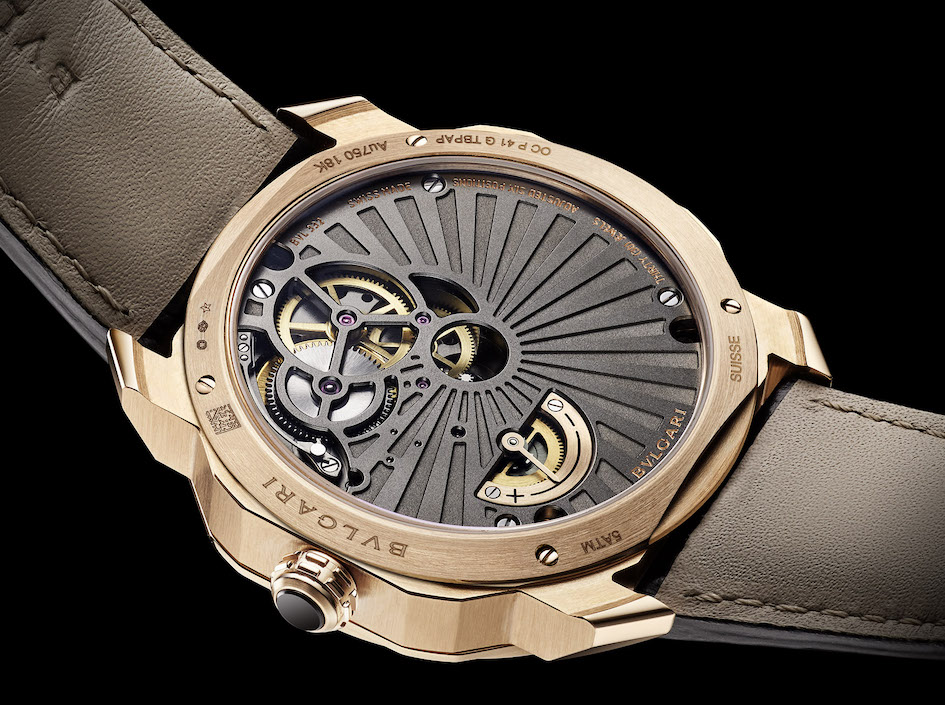 Nella cassa in oro rosa o 41 mm con vetro zaffiro sul fondo, il movimento a carica manuale di Manifattura ha il Tourbillon volant centrale che si ammira dalla finestrella al centro del quadrante nero opaco. Nel Calibro BVL 332, spessore mm 8,76 sono inediti i minuti indicati con due lancette farfalla in oro rosa indipendenti a scomparsa (il sistema è brevettato), Posizionate su un disco di supporto, ognuna ruota lungo un binario circolare di 180°, la prima, segnala l’andamento dei minuti dopo l’ora, la seconda rimane in posizione retratta per tutto il percorso del disco che le trasporta. Dopo il 59° minuto l’indicazione delle 24 ore appare dalla finestrella a ore 12 tramite un disco su cuscinetto a sfere in ceramica e riappare la lancetta dei minuti. L’indicatore della riserva di carica è sul retro, le A/h sono 21.600, i rubini 30.