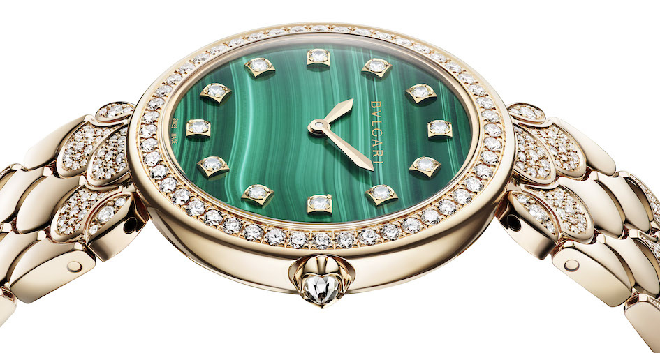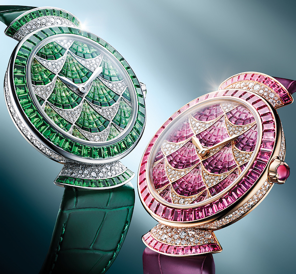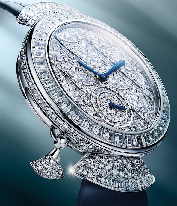 Ed ecco i Divina Mosaica, quasi uno spettacolo pirotecnico che termina con il botto più luminoso. La decorazione del quadrante e del bracciale riprende la forma dei ventagli che troviamo negli antichi mosaici romani delle Terme di Caracalla e sono state scelte pietre di colore degradé (“una vera sfida contro il tempo – ha commentato Fabrizio Buonamassa – agli inizi un paio di volte le forniture sono state restituite, le lavorazioni sono iniziate l’anno scorso e il traguardo era il 30 Agosto, ma alla fine tutto è andato liscio”). I Divina Mosaica con la cassa in oro bianco o 37 mm hanno sui quadranti ventagli con diamanti, tsavoriti o zaffiri rosa, gemme anche tagliate a baguette con effetto neve difficile da raggiungere e sono dotati di movimento meccanico di manifattura a carica automatica, il Calibro BVL 191, ma c’è anche un R.M.